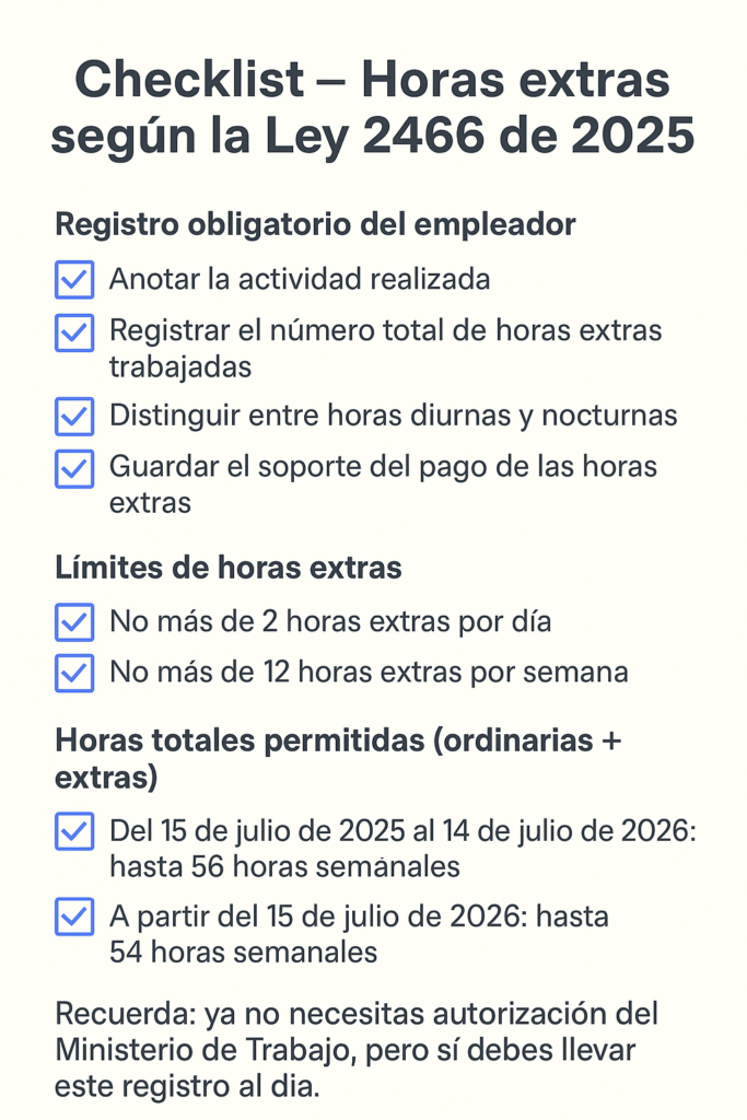 📌 Horas extras: lo que cambia con la Ley 2466 de 2025